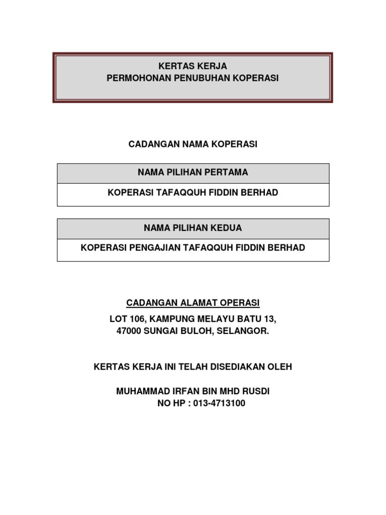 Kertas Kerja Permohonan Penubuhan Koperasi Pdf